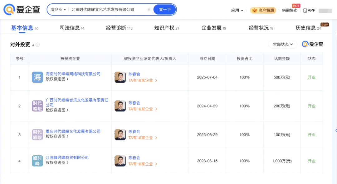 爱企查App显示,北京时代峰峻文化艺术发展有限公司成立于2009年8月,法定代表人为陈春会,注册资本1000万元人民币,经营范围包括营业性演出、演出经纪、网络文化经营、广播电视节目制作经营等,由温素芬、李霏共同持股。