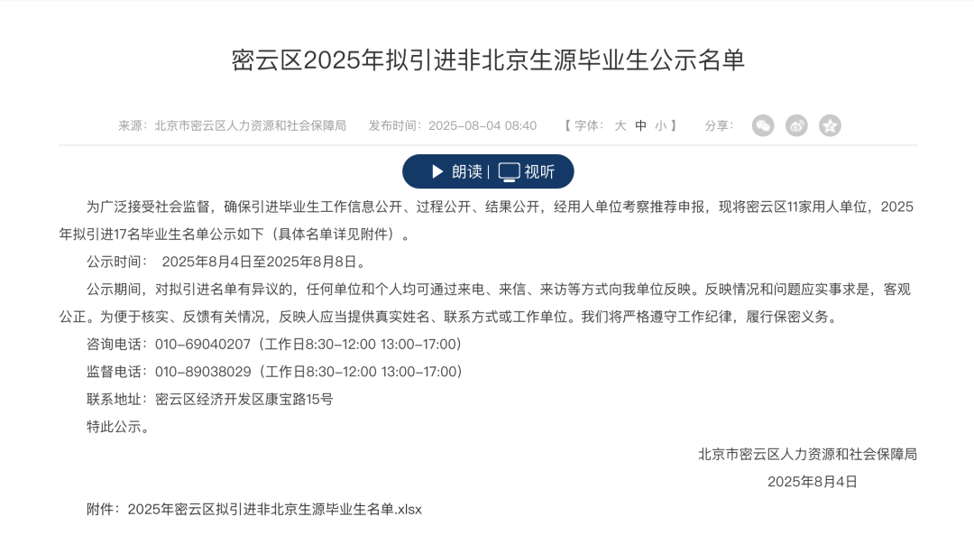据介绍,密云区2025年拟引进非北京生源毕业生公示期为2025年8月4日至2025年8月8日,公示期间,对拟引进名单有异议的,任何单位和个人均可通过来电、来信、来访等方式向北京市密云区人力资源和社会保障局反映。反映情况和问题应实事求是,客观公正。为便于核实、反馈有关情况,反映人应当提供真实姓名、联系方式或工作单位。